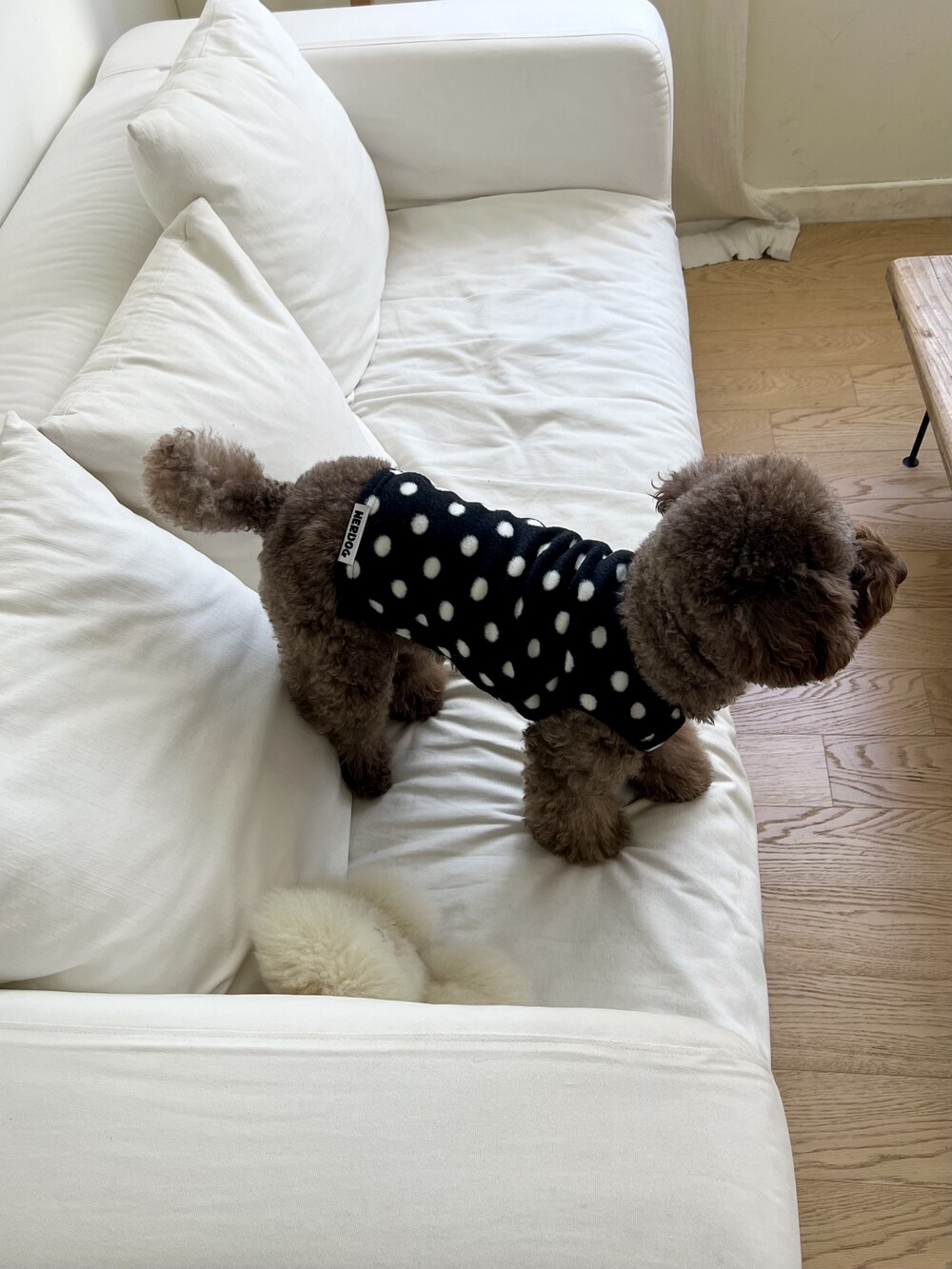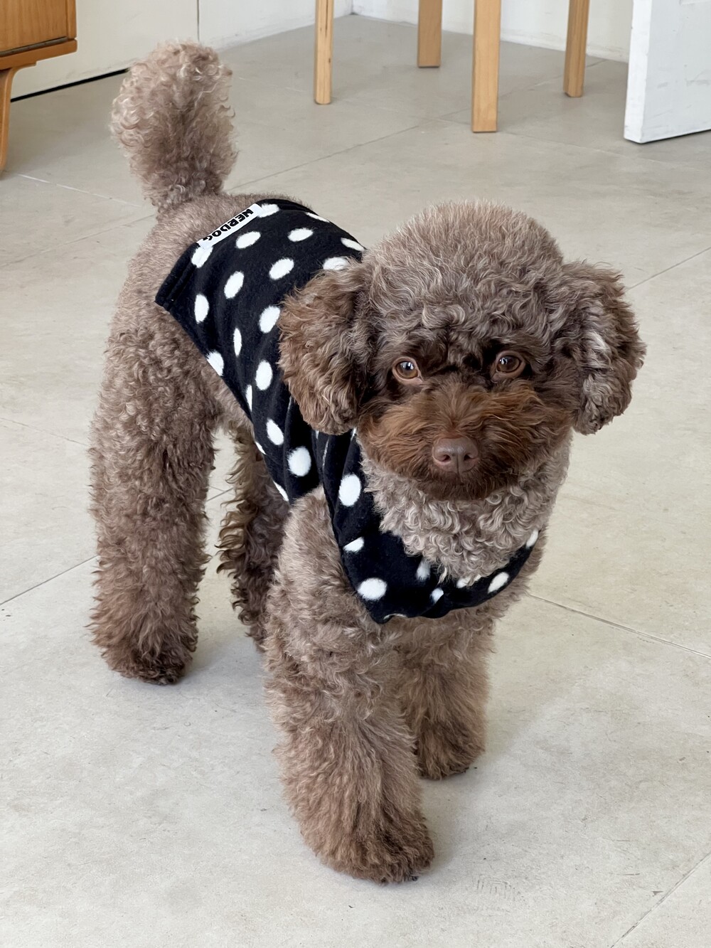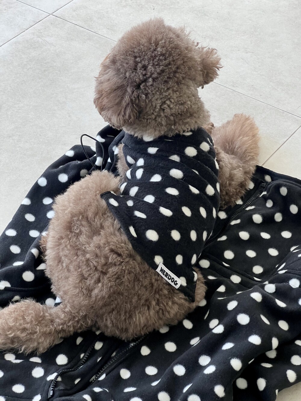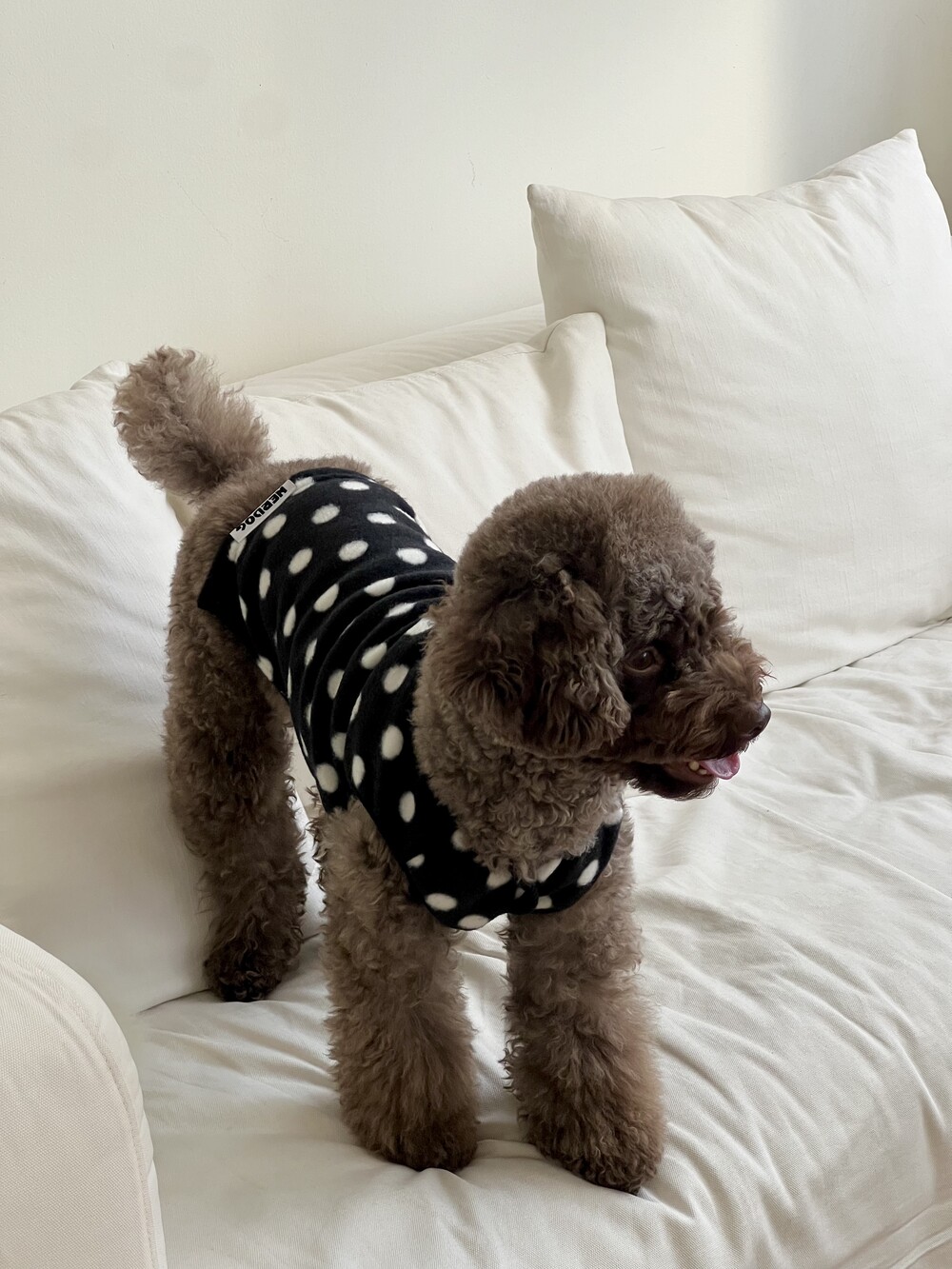 널독이 선보이는 도트 베스트는 팔이 없는 디자인으로 옷을 입지않는 강아지에게도 부담 없이 착용이 가능해요. 다양한 옷과 레이어드가 가능하고 수면조끼로 활용 가능한 유연함을 제공합니다